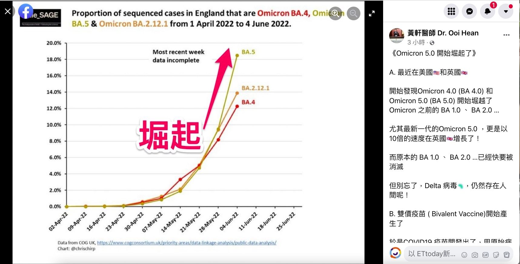 新冠疫情還沒結束,結果又有新一代的Omicron 5.0開始崛起。胸腔暨重症專科醫師黃軒在臉書發文透露,在英國已經以10倍的速度增長。