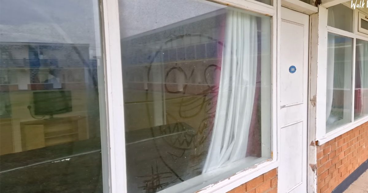 有證據表明牆壁上塗了新油漆,但僅限於某些區域,而公寓樓本身似乎經歷了更好的日子,窗戶玻璃破損,髒話潦草地寫在上面。
