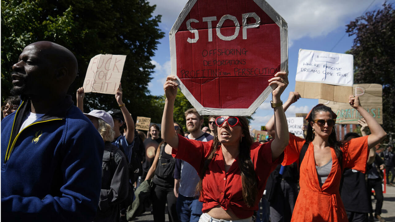 此前,一名高等法院法官上周五推翻了暫停原定於周二進行首次航班的臨時禁令。 當天在倫敦的法院外示威者高喊口號,抗議遣送行動違反人權。抗議人士表示說,該政策不人道,而且將難民置於危險之中。
