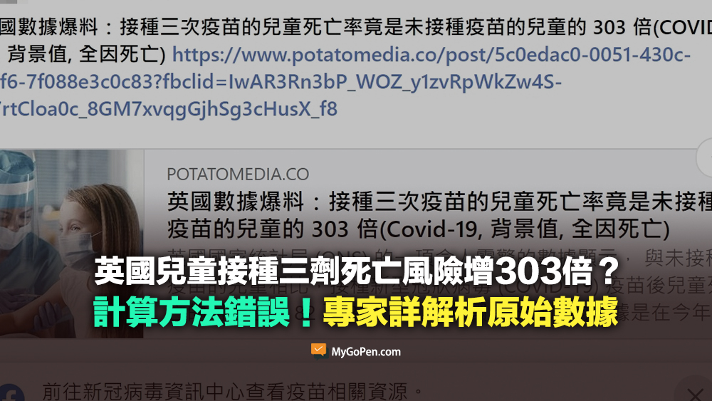 網傳「英國數據爆料:接種三次疫苗的兒童死亡率竟是未接種疫苗的兒童的 303 倍」的訊息,內容聲稱英國 10 – 14 歲兒童接種三劑疫苗後,死亡風險比未施打疫苗的兒童高 303 倍,全因死亡率也大幅攀升。經查證,全因死亡率代表「一定時期內,因為各種原因造成死亡的總人數」,網傳文章引用的數據,並沒有列出詳細死亡原因,不能全部歸類為疫苗引發的不良反應死亡率;此外,文章內計算方法錯誤,由於施打疫苗與未施打疫苗人數差距大,不能互相比較死亡率,而英國 5 – 17 歲兒童優先接種對象,都是針對「一旦感染新冠肺炎可能重症或死亡的高風險兒童」,不能以此高風險族群和一般健康兒童死亡率做比較,網傳消息錯誤。
