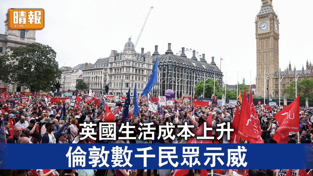 英國數千人上周六(18日)在首都倫敦遊行,抗議百物騰貴,批評政府沒有採取行動應對。