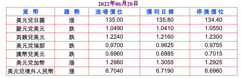 隨著BOJ宣布以固定利率無限量購買公債標的中,增列十年期日本公債類型,作為捍衛0.25%收益率上限行動的一部分,還決定放寬證券借?機制條款,在供應不足時借?給金融機構,解決流動性緊張問題,加重日圓賣壓;此外,FED數據顯示美國5月製造業產出與工業生產分別較前月減少0.1%及增長0.2%均遜於預期,並據世界大型企業研究會公布美國5月領先指標如預期再次下降0.4%,表明經濟增長放緩,但美國明尼亞波利斯聯邦儲備銀行總裁卡什卡利表示支持FED在7月再加息75個基點,之後採取50個基點審慎策略,而且亞特蘭大聯邦儲備銀行總裁博斯蒂克認為FED必須更有力對抗通貨膨脹,提振美元兌日圓至135.42高點。預估今日美元兌日圓支撐於134.80-135.00,阻力於135.70-90。