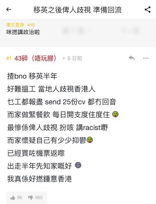 該名港人於連登討論區以「移英之後俾人歧視,準備回流」為題發文,指自己以BNO簽證移英半年時間,但由於工作難找,以及當地人歧視香港人,「乜工都報盡,send 25份CV都冇回音」。他稱現時做餐飲行業,勉強支撐每日開支,最慘是遭到當地人的歧視,以至於現在自我懷疑得了抑鬱症。文章末尾,發帖人表示已經買了回港的機票,出走半年「先知家嘅好」。