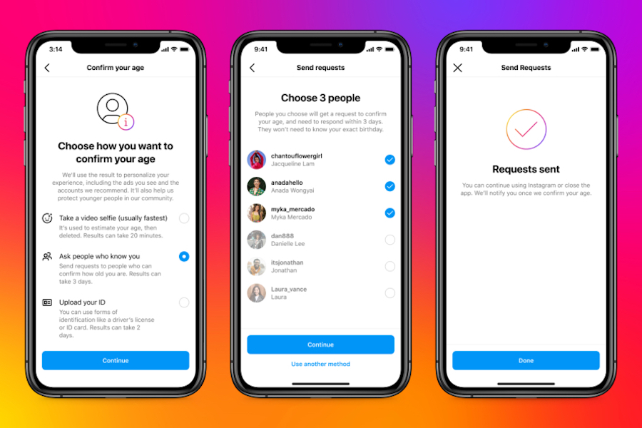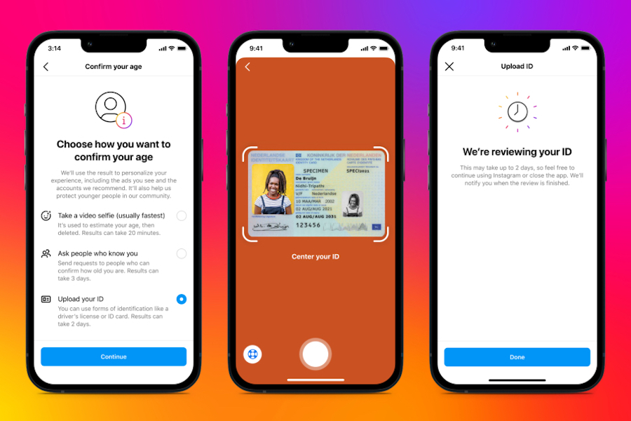 如果沒有 Instagram 可接受的身分證件,更能選擇上傳自拍影片的方法進行年齡驗證。Instagram 與來自倫敦的數位身分新創公司 Yoti 合作,用戶透過手機鏡頭自拍上傳後,Meta 會與 Yoti 共享影像資料,Yoti 則會使用經過特殊訓練的 AI 模型驗證使用者的年齡。Yoti 稱 AI 模型只能估算出年齡,無法識別使用者的真實身分;待驗證過程結束後,Meta 與 Yoti 皆會刪除影像資料。
