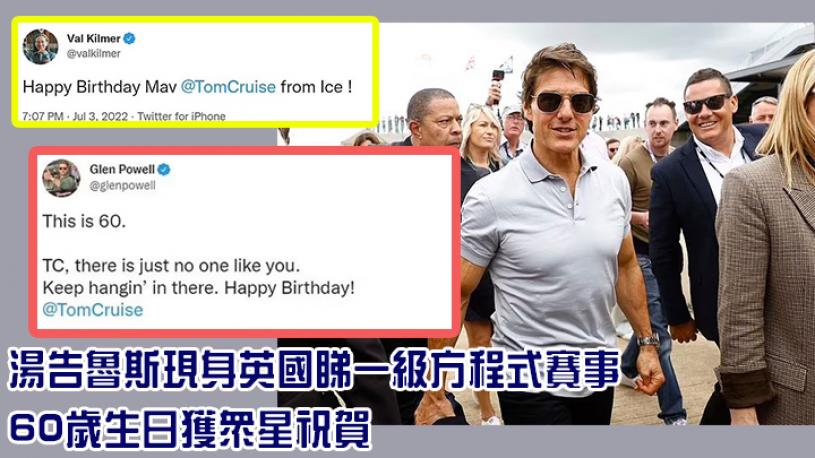 美國影星湯告魯斯(Tom Cruise)本月3日剛度過60歲生日,他現身英國倫敦Silverstone欣賞一級方程式賽事,被大批fans包圍,引起哄動,他又跟名廚Gordon Ramsay及賽車手咸美頓(Lewis Hamilton)的父親Anthony Hamilton聊天,影星米高德格拉斯(Michael Douglas)、辣妹成員Geri Horner等都同場。與湯告魯斯同行的還有《職業特工隊7》導演兼《壯志凌雲︰獨行俠》監製Christopher McQuarrie,日前他在網上公開湯告魯斯親身上陣高難度動作的照片,祝賀對方生日快樂。照片中,湯告魯斯吊在一架傾斜飛行的小型飛機外,並無替身或其他人協助,果然藝高人膽大,相信有關片段會出現於《職7》上部及下部電影中。