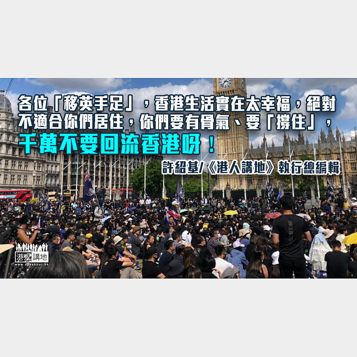 不過說到底,各位「移英手足」,香港生活實在太幸福,絕對不適合你們居住,你們要有骨氣、要「撐住」,千萬不要回流香港呀!