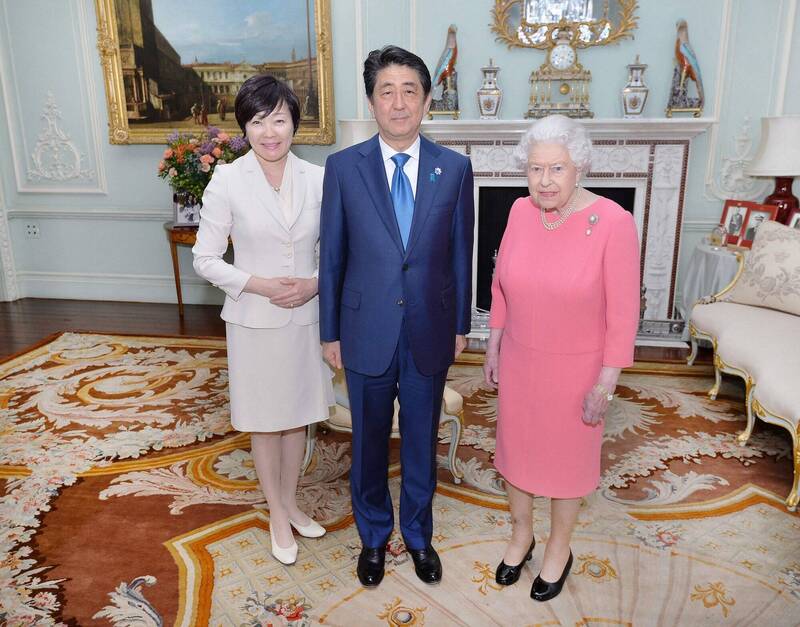 英國女王伊麗莎白二世曾在2016年時接見安倍晉三夫婦,女王對安倍遭到刺殺一事「深感悲傷」。(法新社資料照)