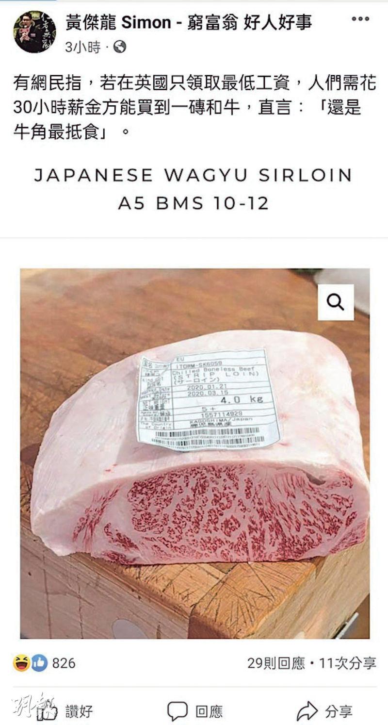 其實英國唔止牛油貴,牛肉都一樣咁貴。叙福樓(1978)主席兼行政總裁黃傑龍就係faceboook專頁開post抽水,話見到有網民講,如果喺英國拎最低工資,要用30個鐘頭嘅人工先買到一磚和牛,所以都係牛角最抵食!提大家,張相顯示日本A5和牛西冷價錢係由22至270英鎊,所以30個鐘真係買「一磚」和牛,唔係一塊㗎。