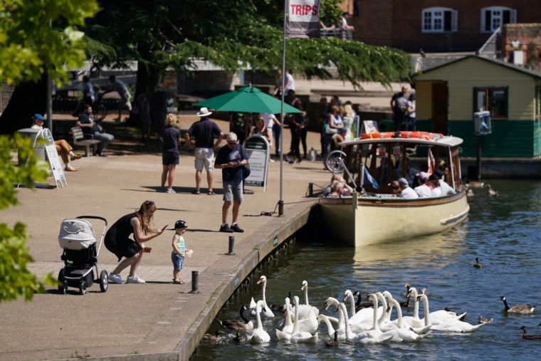 在沃里克郡埃文河畔斯特拉特福享受溫暖天氣的人們。 圖片日期:2022 年 7 月 8 日星期五。PA 照片。 圖片來源應為:Jacob King/PA Wire