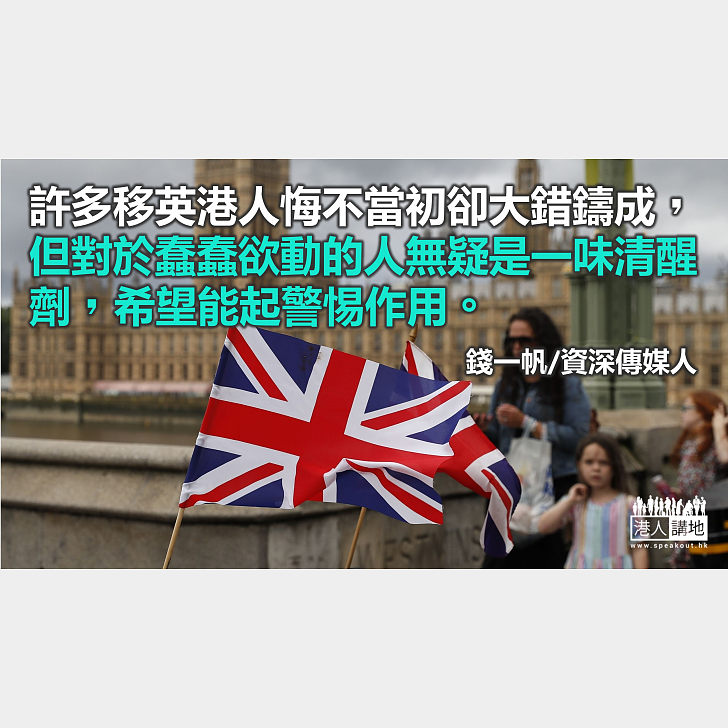 離鄉別井,漂洋過海到一個陌生的地方重頭生活從來不易,可悲的是我們基於錯誤的認知及所謂的情意結,作出了錯誤的抉擇,將自己及家人陷於不利的窘境。許多移英港人悔不當初卻大錯鑄成,但對於蠢蠢欲動的人無疑是一味清醒劑,希望能起着警惕的作用。當然部分港人如果去意已決,亦是他們的選擇!