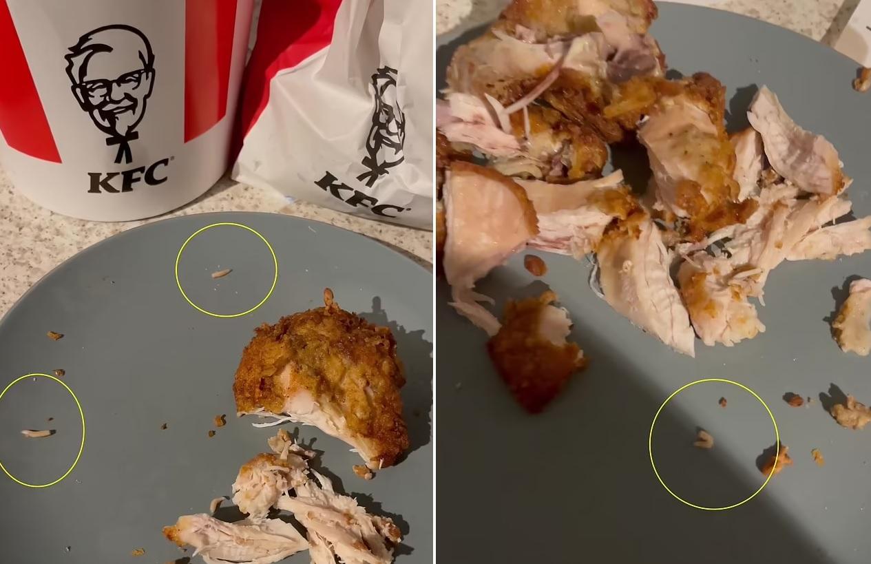 驚嚇!英國北安普敦(Northampton) 24歲女子琼斯(Jay Jones)早前光顧肯德基(KFC)有畢生難忘的經歷……本月3日,她與男友到當地一間肯德基分店,買一桶炸雞外賣回家與母親一起吃。當男友吃完4件雞塊,食得津津有味之際,琼斯的母親突然衝進房裡,叫她們不要吃,因為她在一隻雞翼裡發現5條活生生的蛆蟲。她們即時拍片,可見蛆蟲「郁下郁下」,且活躍地移動,十分嚇人。