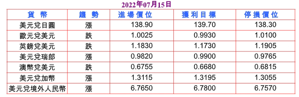 隨後美國報告上周初請失業金人數創八個月來最多24.4萬人,表明勞動力市場降溫,並據FED研究報告顯示本輪量化緊縮或導致加息超過預期,更具破壞性,但美國6月最終需求生產者物價指數(PPI)與核心PPI分別較前月漲1.1%及0.4%,且分別較上年同期攀升11.3%及8.2%,支持FED擴大加息的押注,提振美元兌日圓至139.39高點,但FED理事沃勒及聖路易斯聯邦儲備銀行總裁布拉德相繼認為7月會議加息100個基點的預期可能過頭,限制美元漲勢。預估今日美元兌日圓支撐於138.138.70-90,阻力於139.70-90。