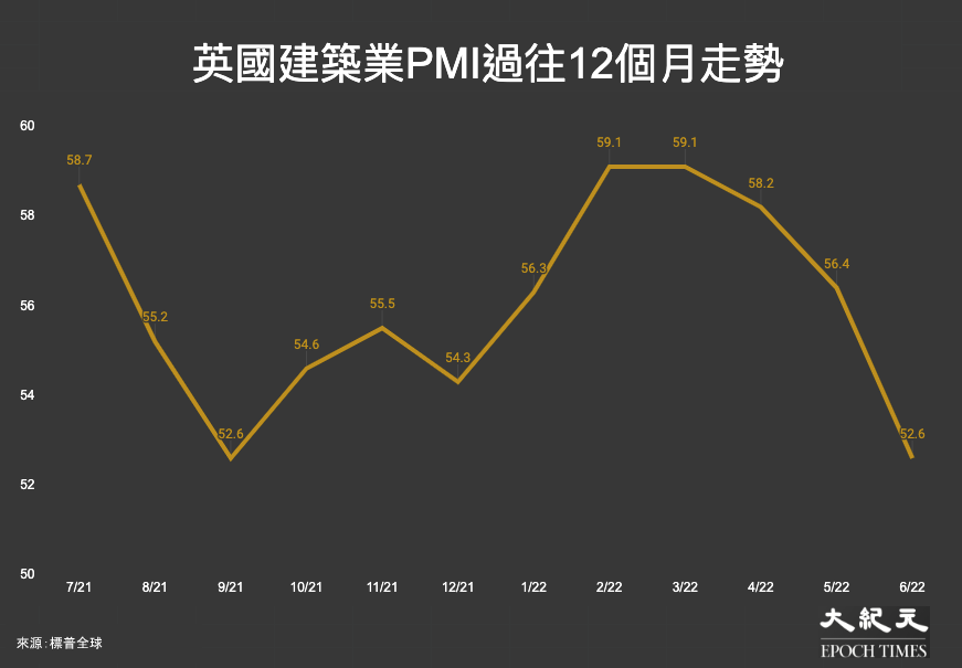 英國建築業PMI過往12個月走勢:2021年7月至2022年6月。(大紀元製圖)