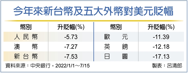 據央行統計,我國與主要貿易對手通貨對美元的匯率表現,除美元外的五大外幣,今年以來至7月15日止,累計跌幅最慘的是日圓,貶幅達17.13%,英鎊及歐元也各自慘摔12.18%、11.39%,澳幣及人民幣貶幅雖低於新台幣,但差距不大,分別為7.27%及5.73%。