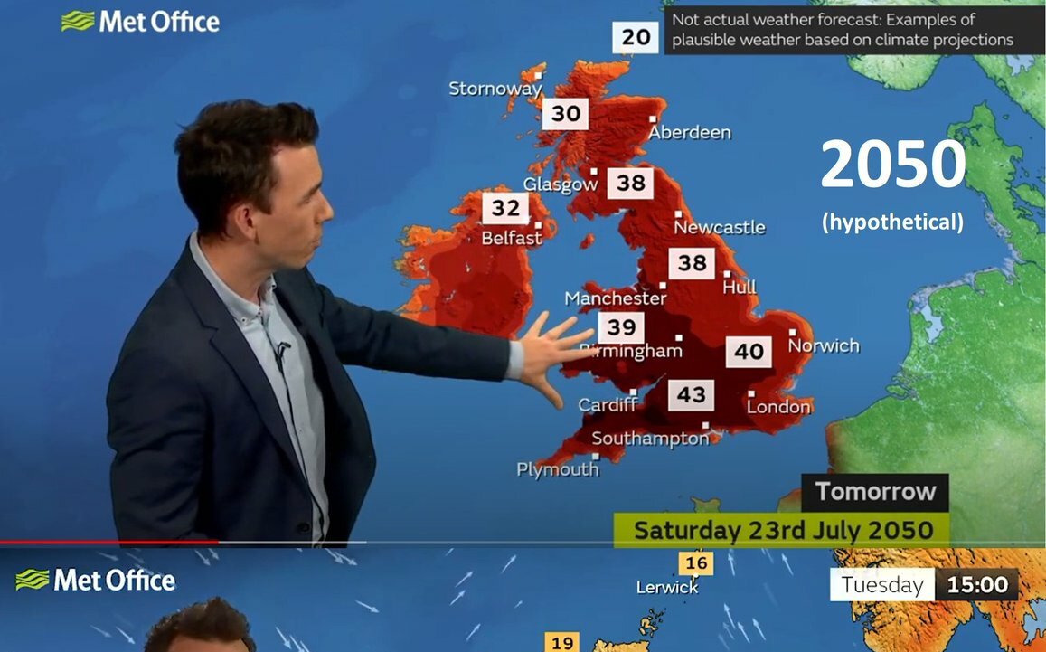 哥倫比亞大學大氣科學家李(Simon Lee)15 日於推文上指出,英國氣象局推測的 2050 年 7 月 23 日氣溫與下週二的天氣預報幾乎完全相同。而後的另一篇文章中,他更稱這樣的情況給了我們洞悉未來的機會。