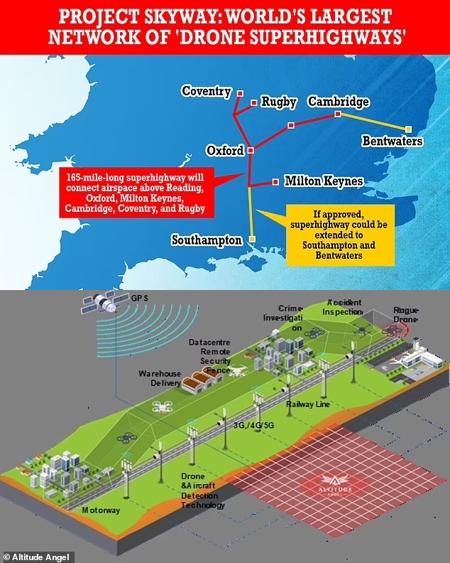 英國政府計畫在未來2年內建造全球最大無人機空中高速公路,並且與先前規劃名為「Project Skyway」的空中高速公路計畫聯動,預計在2024年串連雷丁、牛津、米爾頓凱恩斯、劍橋、考文垂與拉格比上空的空域範圍,藉此讓未來即將投入應用的小型飛航載具,例如發展中的飛行汽車、送貨無人機使用。