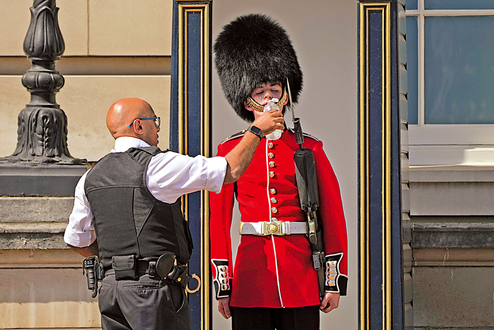 英國19日酷熱難當,一名警察給頭戴傳統熊皮帽的皇家衛兵餵水。美聯社