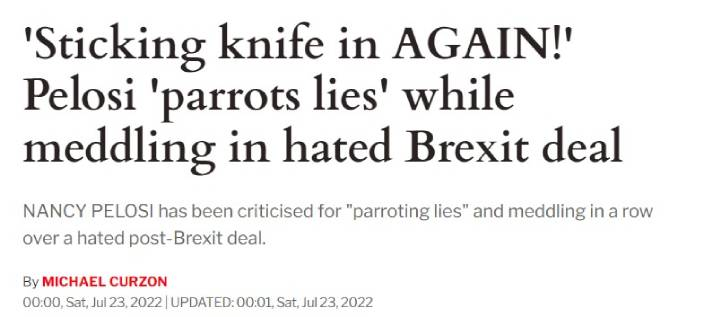 計劃下月訪台的美國眾議院議長佩洛西動作多多,不止挑機中國,還插手入英國脫歐事務,英國《每日快報》近日發文炮轟佩洛西干涉英國脫歐協議,並且「鸚鵡學舌」般重複謊言,等同再次用刀刺向英國。
