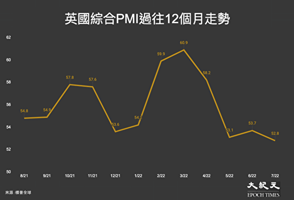 【大紀元2022年07月23日訊】標普全球今天(22日)公布最新英國綜合PMI(採購經理指數)初值,7月份錄得52.8,相比上月53.7有所減弱,惟仍高於50的榮枯線,反映景氣處於擴張狀態。