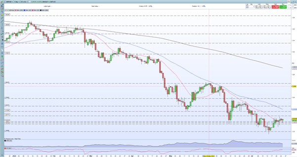 雖然英國政治可能成為本周的頭條新聞並影響英鎊,但本周一系列重量級的美國數據和事件可能會成為英鎊/美元走勢的驅動力。最突出的事件是周四凌晨的FOMC會議,預計美聯儲將再加息75個基點。最新的市場定價顯示,加息75個基點的可能性為76.3%,加息100個基點的可能性為23.7%。此外,周四美國時段將公布的美國第二季度GDP(增長率可能為負值)初值和周五公布的核心PCE通脹率將使交易者對美國經濟狀況有一個更好的認識。