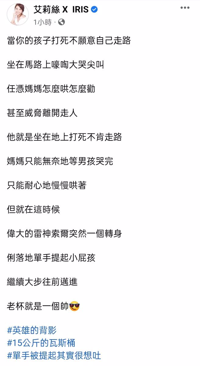 艾莉絲今(26日)發文,透露孩子打死不願意自己走路,坐在馬路上嚎啕大哭尖叫,無論她怎麼勸怎麼哄,甚至威脅要離開走人,小孩就是坐在地上打死不肯走路,她只好無奈地等兒子威廉弟哭完,沒想到就在這時候英國老公馬培迪出手了,「偉大的雷神索爾突然一個轉身,俐落地單手提起小屁孩 ,繼續大步往前邁進,老杯(爸)就是一個帥」,神隊友舉動讓愛利絲直誇是「英雄的背影」,更形容兒子的體重是「15公斤的瓦斯桶,單手被提起其實很想吐」。