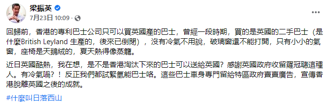 帖文末尾,梁振英還附上“什麼叫日落西山”的標籤。強調香港回歸後成就驕人,而“日落西山”的英國根本沒資格對香港事務指手畫腳。