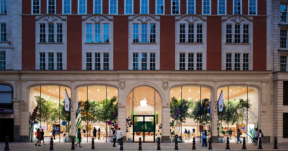 Apple 全新零售店正式登陸英國倫敦繁華的 Knightsbridge 區,本店坐落在 Brompton Road 鄰近海德公園,訪客可經由中央拱廊進入零售店,拱廊尺寸參照了原建於 1903 年的 Brompton Arcade,門店設計特地以當地植物群為靈感,映入眼簾的是排列在 7 米高落地窗和通道旁 12 棵高聳的西西里榕樹,令店內外渾然一體,將大自然融入店內,接著走在鋪上植物製生物樹脂構成的水磨石地板,同時也是全球首間採用此物料的 Apple 零售店。