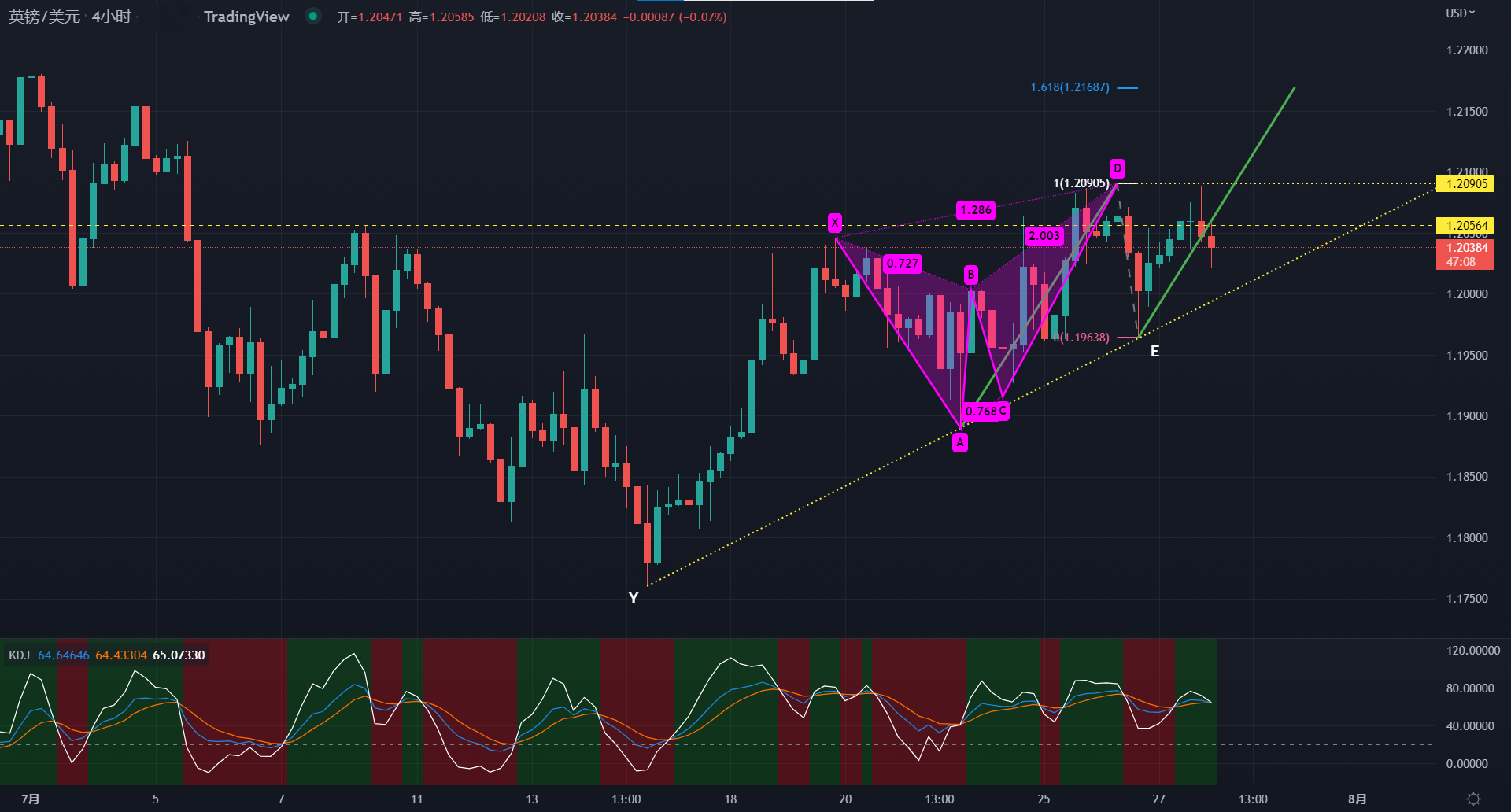 隨後價格一度回撤至1.1964(7月26日低點,E點),同時受到0.382YD和0.618AD兩組諧波模式及Y點以來的上行趨勢線支持並再度反彈。不過價格未能刷新近期高點,而下行則暫時止步於1.2020附近,短期陷入方向性選擇。