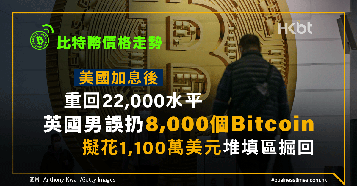 【比特幣】美國加息0.75厘符合預期,亦讓比特幣現升勢,重上22,000美元關口。雖然未清楚升勢能否令投資者重拾信心,不過於英國則有名男子因不小心扔掉一個內藏8,000個Bitcoin的硬碟,現計劃用逾千萬美元尋回。一文詳細報道。