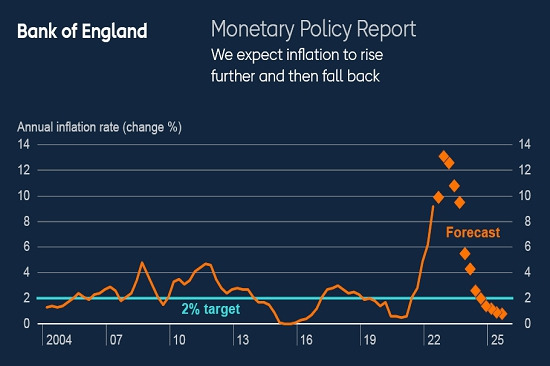 英倫銀行預期,通脹10月份達13.3%峰值,並在2023年大部分時間維持非常高水平。