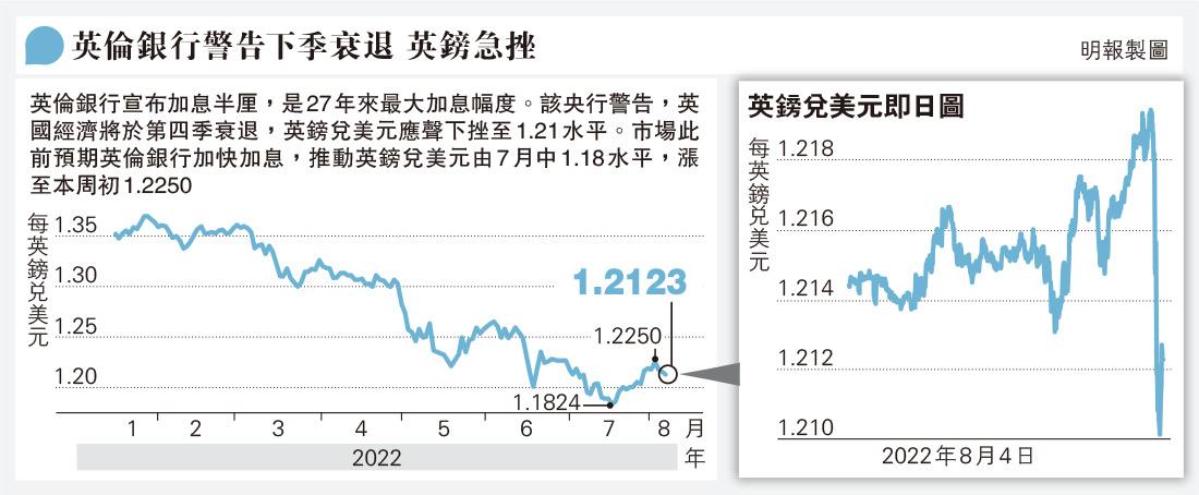 英鎊兌美元昨晚應聲下滑,曾跌穿1.21,跌幅超過100點子(1元等如10,000點子)。此前受擴大加息的預期影響,英鎊兌美元曾由7月中的1.18低位,升至本周初的1.2250。英鎊兌港元昨晚貼近9.5水平。英國兩年期與10年期國債孳息率昨晚一度倒掛,是2019年以來首次,反映市場看淡英國經濟前景。此外,美國上周首次申領失業救濟人數按周增6000人,市場觀望周五公布的美國7月非農職位數據,美股三大指數早段偏軟。美國10年期國債孳息率跌穿2.7厘。美國原油及汽油庫存意外增加,引發需求放緩的擔憂,紐約期油昨晚跌穿每桶90美元,布蘭特期油跌穿每桶95美元。