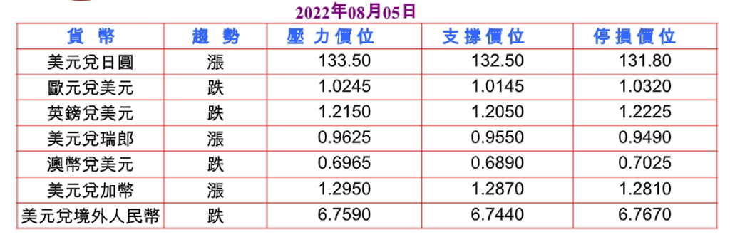 隨著出口飆升至紀錄新高,美國6月貿易逆差大幅縮窄至796億美元,可能在第三季繼續對國內生產總值(GDP)做出貢獻,並據全球再就業公司報告顯示,7月美國企業宣布裁員人數下降20.6%至2.5810萬人,但上周美國初請失業金人數意外增至26萬人,表明勞動力市場趨緩,引發市場擔憂週五發布的美國就業數據遜於預期,而且中國與美國關係緊張,導致美國公債收益率下滑,拖累美元兌日圓跌至132.75低點。預估今日美元兌日圓支撐於132.30-50,阻力於133.40-60。