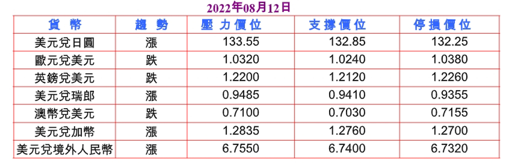 隨後美國公布一周初請失業金人數增至26.2萬人,為連續第二周上升,表明勞動力市場進一步放緩,而且7月最終需求生產者物價指數(PPI)較前月跌0.5%,為2020年4月以來首次環比下降,並較上年同期升9.8%遜於預期,打擊美元兌日圓至131.72低點,但聯邦基金利率期貨顯示FED在9月加息50個基點與75個基點的可能性仍分別有58%及42%,扶助美元收復大部分失地。預估今日美元兌日圓支撐於132.65-85,阻力於133.50-70。