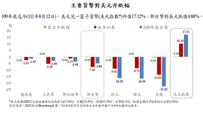 美元優利定存已成為銀行財管主流商品,短天期優利一度超過8%,實際上新台幣兌美元匯率徘徊、扣關30元已近一個月,央行統計,今年以來新台幣匯率亦已貶值7.61%。匯銀分析師認為,美元指數目前已過了今年高峰,且聯準會利率調整和通膨率變動透露出強勢美元正處於頂部。