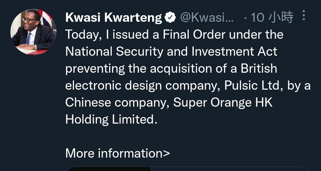 涉及的香港超橙控股有限公司(Super Orange HK Holding Limited),早前提出全面收購英國一間軟件開發公司Pulsic Ltd,不過英國商務大臣關浩霆表示,因相關英國公司的知識產權及技術,可用作建立國防及科技能力,包括集成電路建設,並可用於軍事用途,故決定終止收購案。