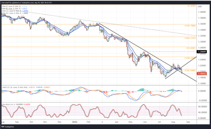 最終,滯脹的跡象困擾着英國經濟,這對英鎊走勢而言是個利空消息。疊加英國首相競選—其中一位候選人特拉斯(Liz Truss)曾暗示她將取消英國央行(BOE)的通脹使命,轉而專注於經濟增長。隨着8月下旬的到來,英鎊走勢處於較為不利的地位。