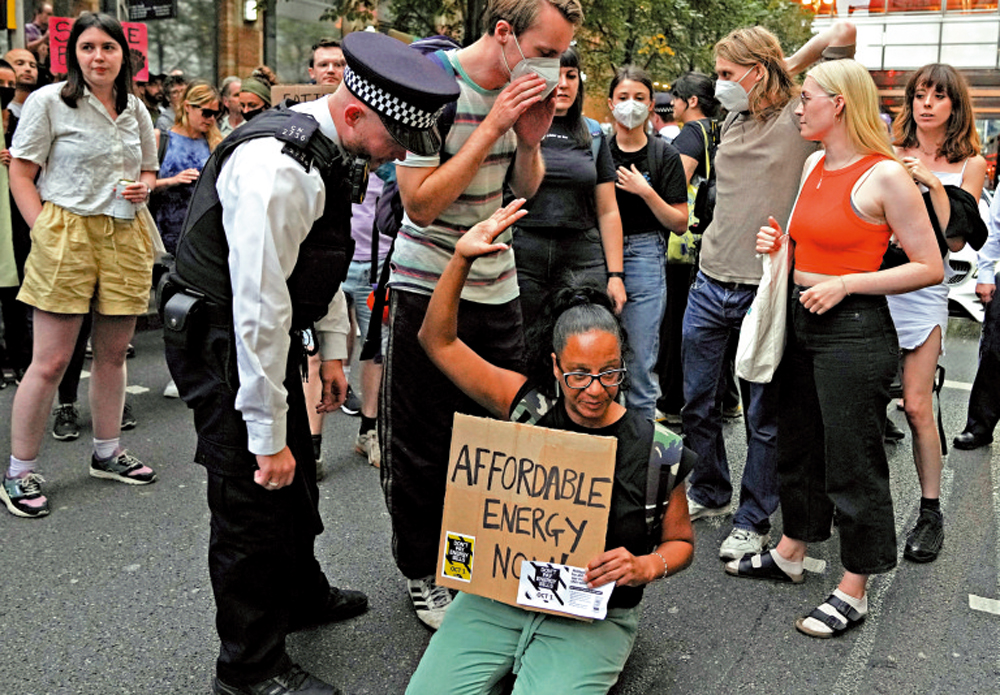 圖:英國民眾26日走上倫敦街頭,抗議當局提高能源價格上限。路透社