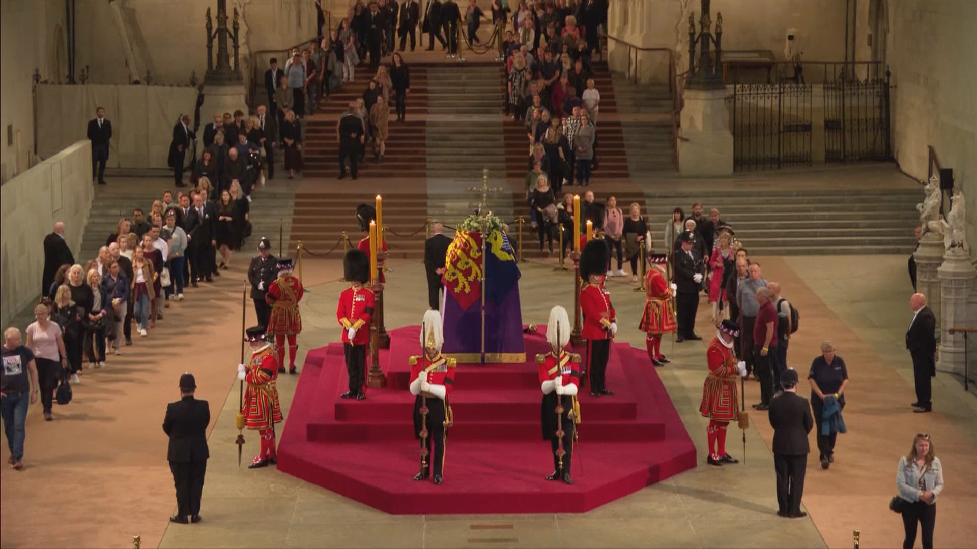 英女王伊利沙伯二世的靈柩停放在西敏宮的西敏廳,靈柩蓋上王室旗,並放有王冠、花圈和權杖。大批民眾排隊入內,經由兩旁通道瞻仰,送別伊利沙伯二世,很多人忍不住傷心落淚,有人向靈柩鞠躬和獻上飛吻。