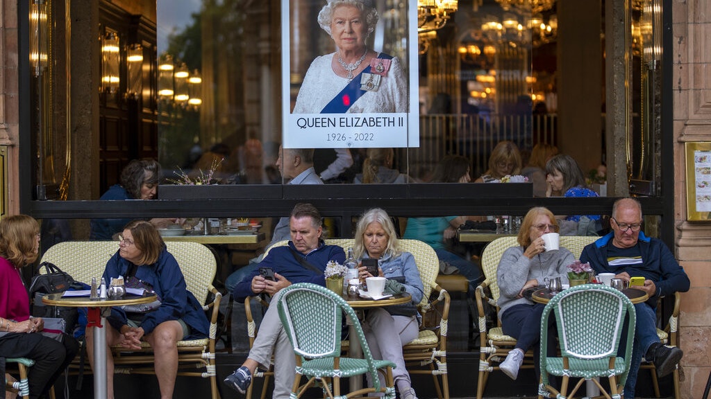 英女王逝世刺激民眾外出及遊客到訪悼念及觀看喪禮儀式、購買王室記念品,預期能帶來短暫經濟刺激。(AP),