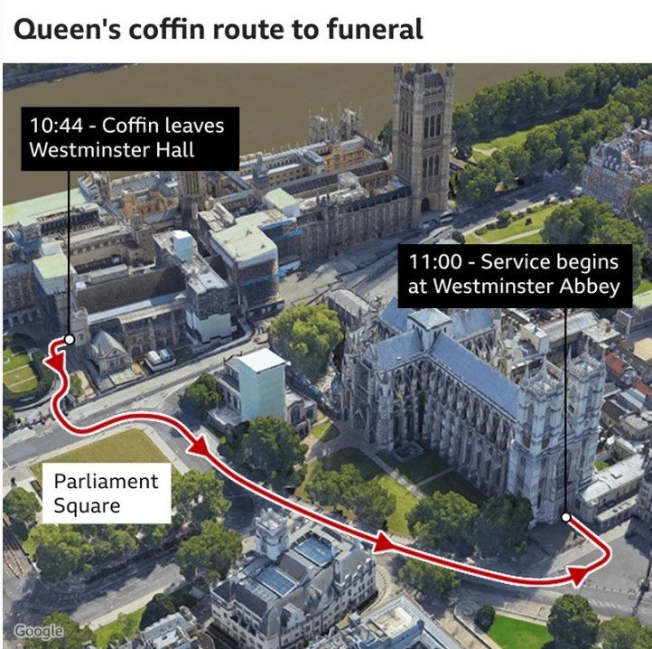 台灣時間下午5點44分,女王的靈柩將從西敏廳移往西敏寺進行國葬儀式,靈柩將置於皇家海軍國家砲車上、並由142名海軍陪同,而新國王查理三世(King Charles III)、威廉王子(Prince William)和哈利王子(Prince Harry)在內的王室高級成員也將跟隨砲車送葬隊伍,途中行經國會廣場(Parliament Square)時將有英國皇家海軍陸戰隊樂隊(Royal Marines Band Service)陪同的三軍儀仗隊致意。