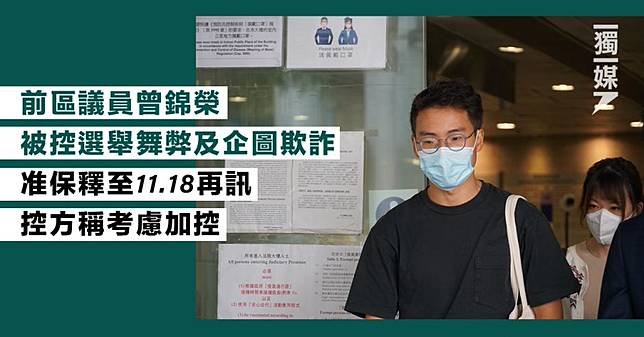 (獨媒報導)前屯門區議員曾錦榮涉在2020年立法會選舉中詐騙選舉開支,昨日離境時在機場再次被捕,被廉政公署正式落案起訴違反《選舉(舞弊及非法行為)條例》及企圖欺詐,今日(23日)在東區裁判法院提堂。曾錦榮獲准保釋。控方申請押後至11月18日再訊,並表示將考慮新增其他控罪,獲裁判官溫紹明批准。