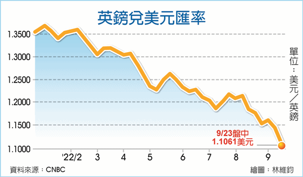 英國公布1970年代以來最大幅度的減稅計畫後,英鎊狂瀉1.5%,兌美元跌破1.103美元,創下37年新低紀錄。投資人拋售英國公債,10年期英債殖利率衝高至3.8%,英股富時100指數重跌至3月以來新低紀錄。