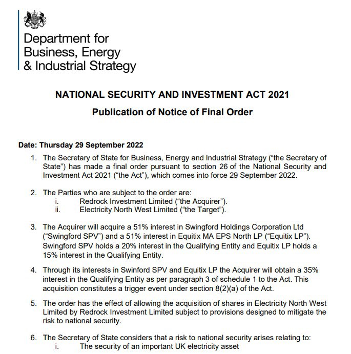 英國商業、能源及產業策略部的聲明表示,這項收購案關乎英國重要電力資產,認為收購案可以繼續進行,但必須遵從上述限制,包括不得和中方分享敏感資訊,及限制中方股東對企業重要員工的任命權,以減輕英國國安風險。「部長認為這項最終命令,是有必要而且相稱的措施,以減輕國家安全風險。」