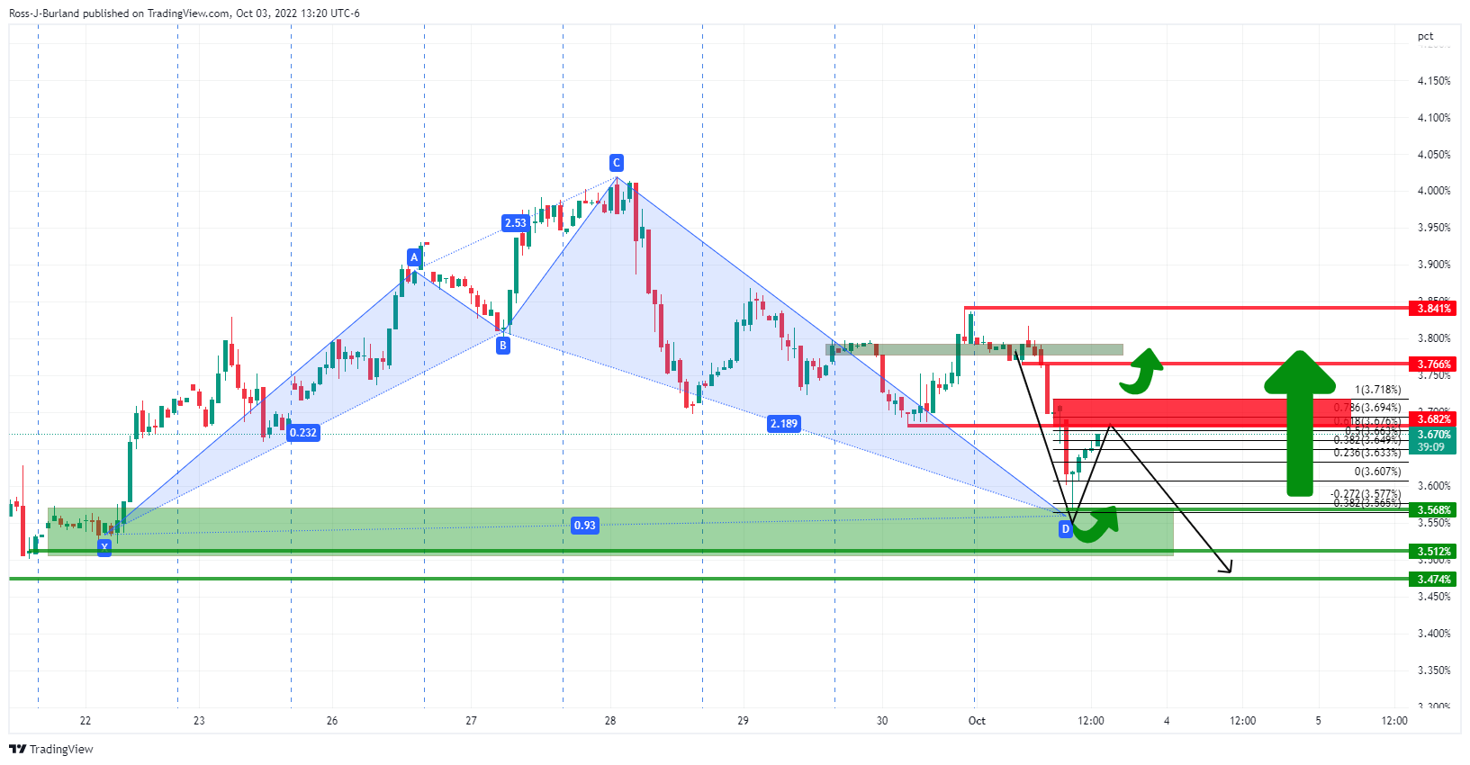 10年期美債收益率已跌至關鍵支撐區域,小時圖構築看漲的諧波鯊魚形態。隨後10年期美債收益率出現上漲,測試可能後市構成阻力的前期支撐。然而,如果這一區域得以突破,那麼將提振處在疲軟的美元,並預計將打壓英鎊。