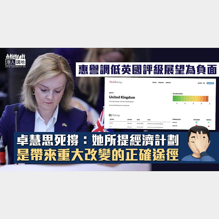 英國首相卓慧思早前提出大幅減稅及政府借貸,結果相關措施觸發市場動盪。而財相關浩霆在提出降低針對年收入15萬英鎊以上人士徵收45%個人所得稅最高稅率後不久,亦宣布撤回措施。不過,卓慧思認為,她提出的經濟計劃是帶來重大改變的正確途徑。另一邊廂,評級機構惠譽雖維持英國的信用評級在AA-,但調低其評級展望,由穩定改為負面。