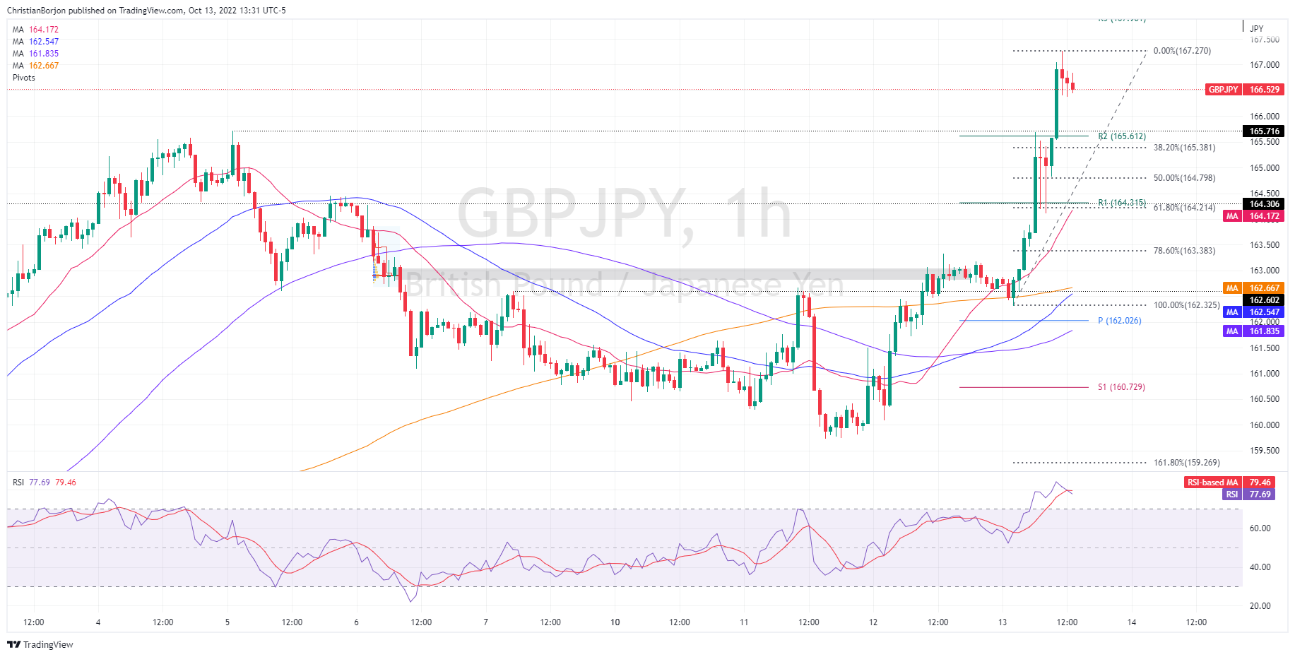 因此,匯價第一個支撐位將是38.2%斐波位和R2樞軸水平匯合處165.38 – 61附近,然後是50%斐波位164.79附近。若匯價跌破該水平,將測試20週期均線和R1日線樞軸水平匯合處164.21 – 31附近,然後英鎊/日元可能將反彈測試167.94水平。