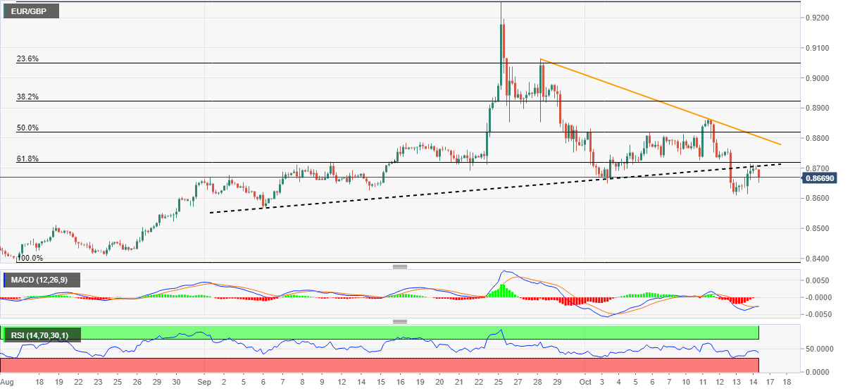 另外,若匯價出現反彈,不僅需要突破支撐反轉成的阻力線(截止發稿時在0.8705附近),還需要突破8月17日至9月26日上行趨勢的61.8%斐波位(截止發稿時為0.8718)來吸引買家。