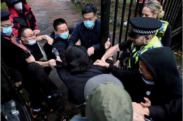 「我們不能允許中共把他們的一貫做法帶進來:對抗議者的毆打、對言論自由的壓制,以及一次又一次地不允許在英國領土上舉行抗議。這是令人不寒而栗的升級。”