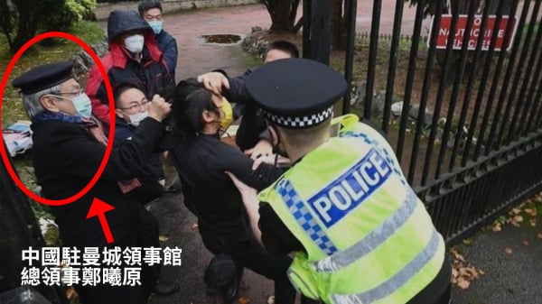 中共二十大開幕之際,一群居英港人到中國駐曼徹斯特總領事館抗議,遭不明身份人員推搡毆打。英國議會議員艾麗西亞·卡恩斯(Alicia Kearns)10月18日表示,中國駐曼徹斯特總領事鄭曦原參與針對示威者的暴力事件。