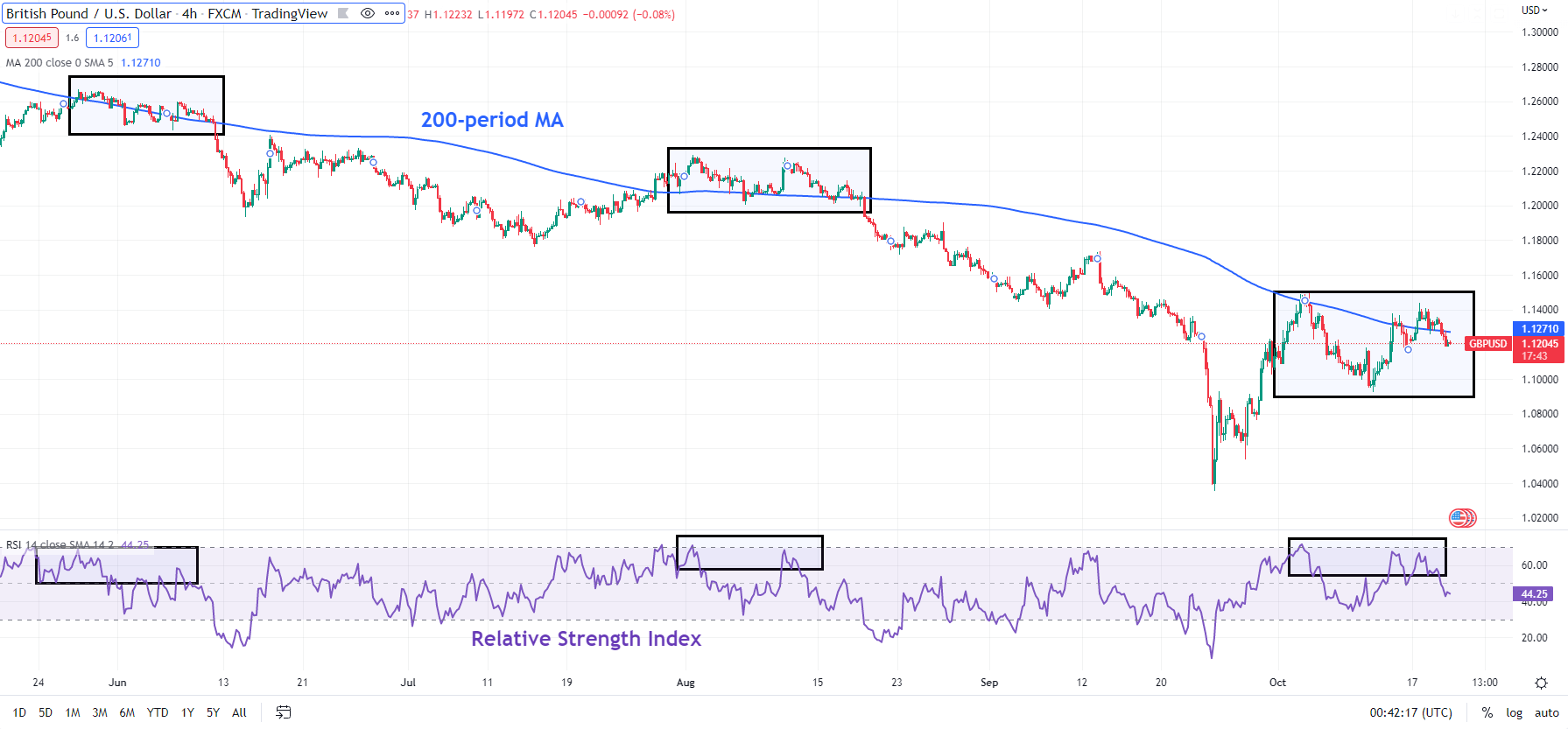 在4小時圖上,英鎊/美元自10月初就開始受到200-SMA線的阻礙(見下方圖表)。此外,即使初步上行的幅度相當陡峭,相對強弱指標顯示出的動能仍未能助匯價創出新高。在過去的兩年內,類似的上行趨勢被更長期限的移動均線所限制,而RSI指標也被限制在70下方。
